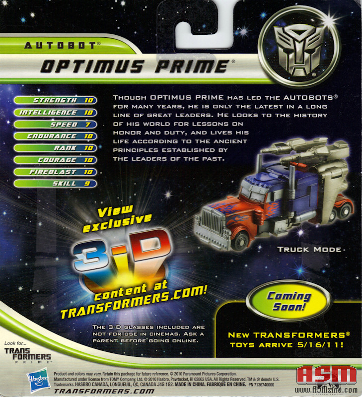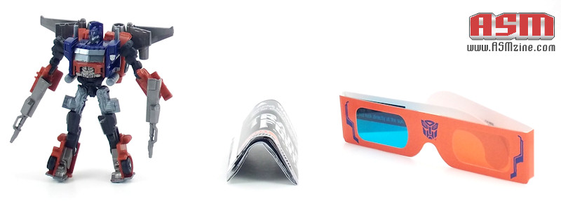 Includes: Optimus Prime, jetpack, two weapons, 3-D glasses, instruction booklet