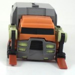 Changing him to robot mode is pretty simple. Swing up the fork lift arms, lift up the truck bed, fold in the cab wheels and cab itself, pull out his legs, swing down and rotate the arms, flip out his head, and put the truck bed on his back, fold out hands and feet, and presto, you’ve got Wreck-Gar in robot mode. His face is reminiscent of the Generation 1 Wreck-Gar with the beard and mustache, but you can also see how his head was based on an old TV, and you can also see hints of “Weird Al” Yankvic, the voice actor for Wreck-Gar. Sure, he’s got a dump truck on his back, but that’s how he had it in the show, and two, he’s so awesome you don’t mind.