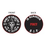 Each hefty coin is crafted of solid metal and die struck. Each color is individually added by hand before being fired at over 500 degrees Fahrenheit for 24 hours to ensure maximum durability. In the final step, the coins are weathered to give them a well worn finish, as though Clay or Jax has been carrying them in his jeans pocket.